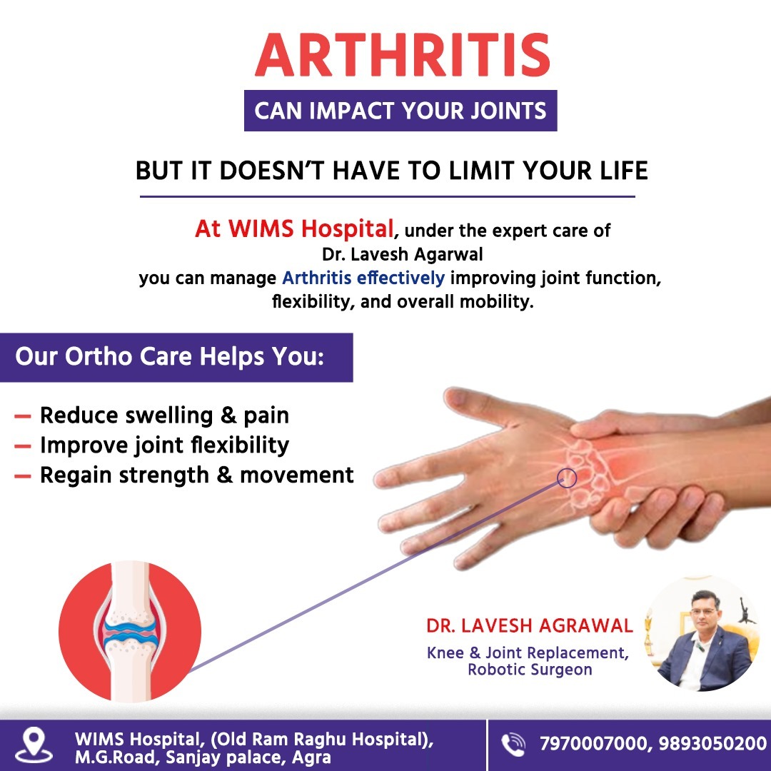 Best Arthritis Doctor in Agra - Dr. Lavesh Agrawal | WIMS Hospital Joint pain can slowly take away the simple joys of life - walking comfortably, climbing stairs, or even getting out of bed without that morning stiffness. Many people ignore these early signs, thinking it’s just “age catching up.” But arthritis isn’t just about age - it’s about joint health, and it can be treated effectively with the right care. At WIMS Hospital (Old Ram Raghu Hospital), M.G. Road, Sanjay Palace, Agra, Dr. Lavesh Agrawal is known for giving patients their active life back. He’s a trusted name in orthopedics, especially when it comes to arthritis and joint pain treatment. Over the years, he’s helped hundreds of people walk without pain, move freely, and smile again. Dr. Agrawal believes that every patient’s pain is different - and so is their treatment. He starts with listening carefully, understanding your daily struggles, and then finding out what’s really happening inside your joints. Using modern diagnostic methods and a patient-first approach, he designs a treatment plan that suits your condition and lifestyle. For some, it’s about early intervention - medicines, physiotherapy, or PRP therapy that helps reduce pain and improve mobility. For others, especially where the damage is severe, knee or hip replacement surgery becomes the best option. What makes Dr. Lavesh stand out is his focus on minimally invasive techniques, which means faster healing, less pain, and a quicker return to normal life. Many patients say that meeting Dr. Lavesh changed their outlook completely. He explains things in simple language, guides you through every step, and genuinely cares about your comfort - not just as a doctor, but as someone who understands what pain can do to your confidence. At WIMS Hospital, you’ll find a warm, professional environment where every patient gets personal attention. From diagnosis to recovery, the entire team works together to ensure you get the best possible care. The hospital is equipped with modern facilities, digital imaging, and advanced operation theaters - everything needed for world-class orthopedic treatment right here in Agra. Arthritis doesn’t just affect joints - it affects how you live. But with timely treatment, you can absolutely take control again. Whether it’s knee pain, hip stiffness, or joint swelling that’s been bothering you for months, don’t wait until it gets worse. One consultation could change everything. If you’ve been searching for the best arthritis and joint pain doctor in Agra, Dr. Lavesh Agrawal is a name you can trust. His experience, compassionate approach, and dedication to patient care make him one of the most respected orthopedic specialists in the city. 📍 Location: WIMS Hospital (Old Ram Raghu Hospital), M.G. Road, Sanjay Palace, Agra 📞 Book Appointment: 7970007000, 9893050200 ✨ Dr. Lavesh Agrawal – The trusted name for arthritis and joint pain care in Agra