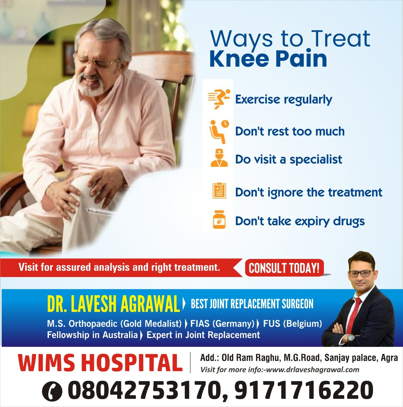 Best Doctor for Knee Pain Treatment In Agra If you are searching for the best doctor for knee pain treatment in Agra, Dr. Lavesh Agrawal at WIMS Hospital, Agra is a trusted name in advanced orthopedic care. With years of experience in treating knee pain caused by arthritis, ligament injuries, cartilage damage, sports injuries, and age-related wear and tear, Dr. Lavesh Agrawal best orthopedic surgeon in Agra provides accurate diagnosis and personalized treatment plans. There are several effective ways to treat knee pain depending on the condition. These include lifestyle modifications, physiotherapy, pain management medications, PRP injections, and minimally invasive procedures. For severe cases, advanced surgical options such as knee arthroscopy or knee replacement surgery are also available at WIMS Hospital using modern techniques for faster recovery. Patients receive compassionate care, clear guidance, and long-term relief-focused treatment. If knee pain is affecting your mobility or daily life, consult Dr. Lavesh Agrawal at WIMS Hospital for expert and reliable knee pain treatment in Agra.