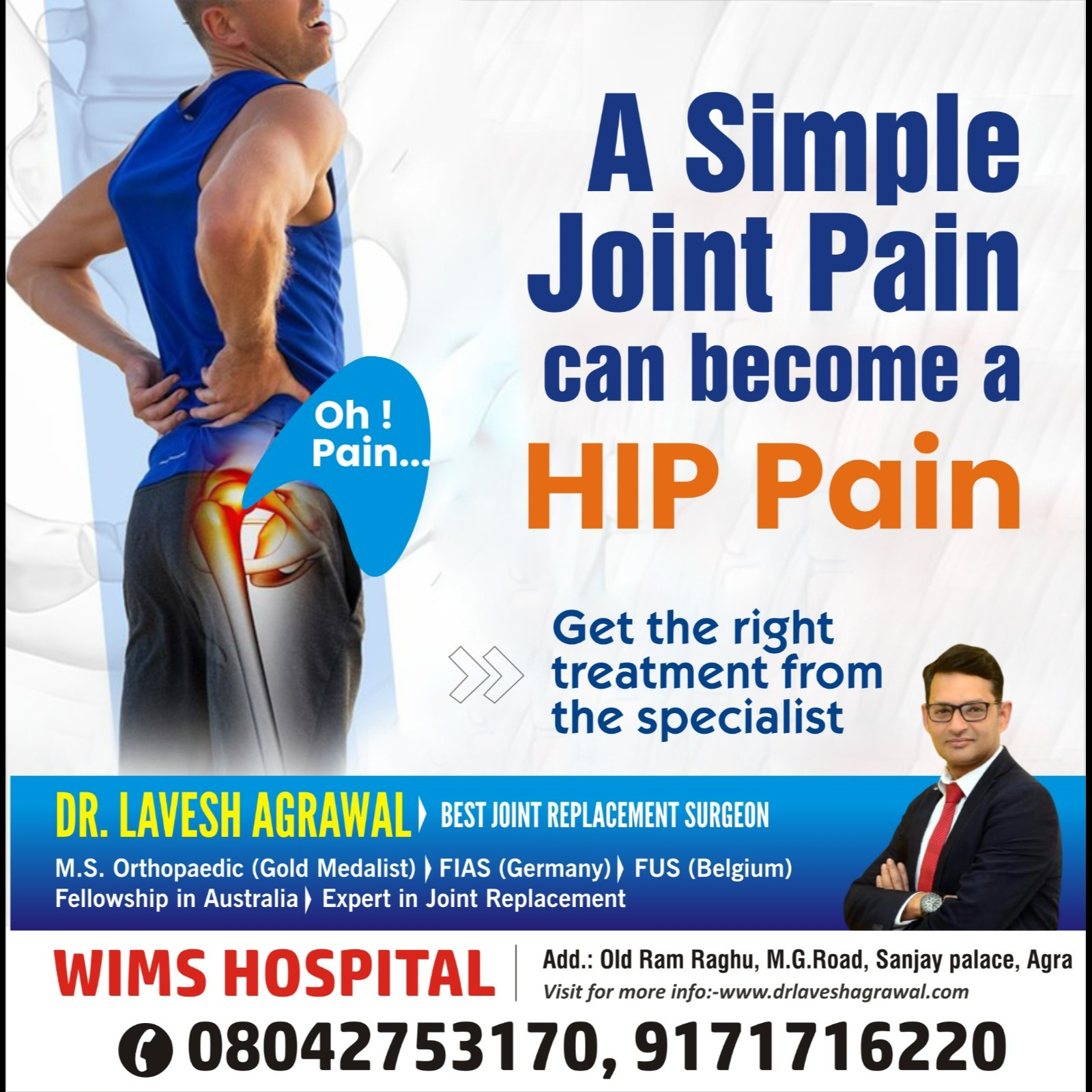 Best Hip Pain Specialist in Agra If you are suffering from persistent hip pain, stiffness, or difficulty walking, Dr. Lavesh Agrawal at WIMS Hospital is one of the best hip pain specialists in Agra. With extensive expertise in treating hip arthritis, sports injuries, fractures, bursitis, and age-related wear and tear, he offers accurate diagnosis and personalized treatment plans for long-lasting relief. Dr. Lavesh Agrawal best orthopedic doctor in Agra specializes in both non-surgical and surgical solutions, including advanced hip replacement techniques that ensure faster recovery and improved mobility. His patient-centric approach, modern facilities, and commitment to quality care make him a trusted choice for people seeking effective hip pain treatment in Agra. Regain your movement and live pain-free with expert hip care at WIMS Hospital . Let your healing begin today.