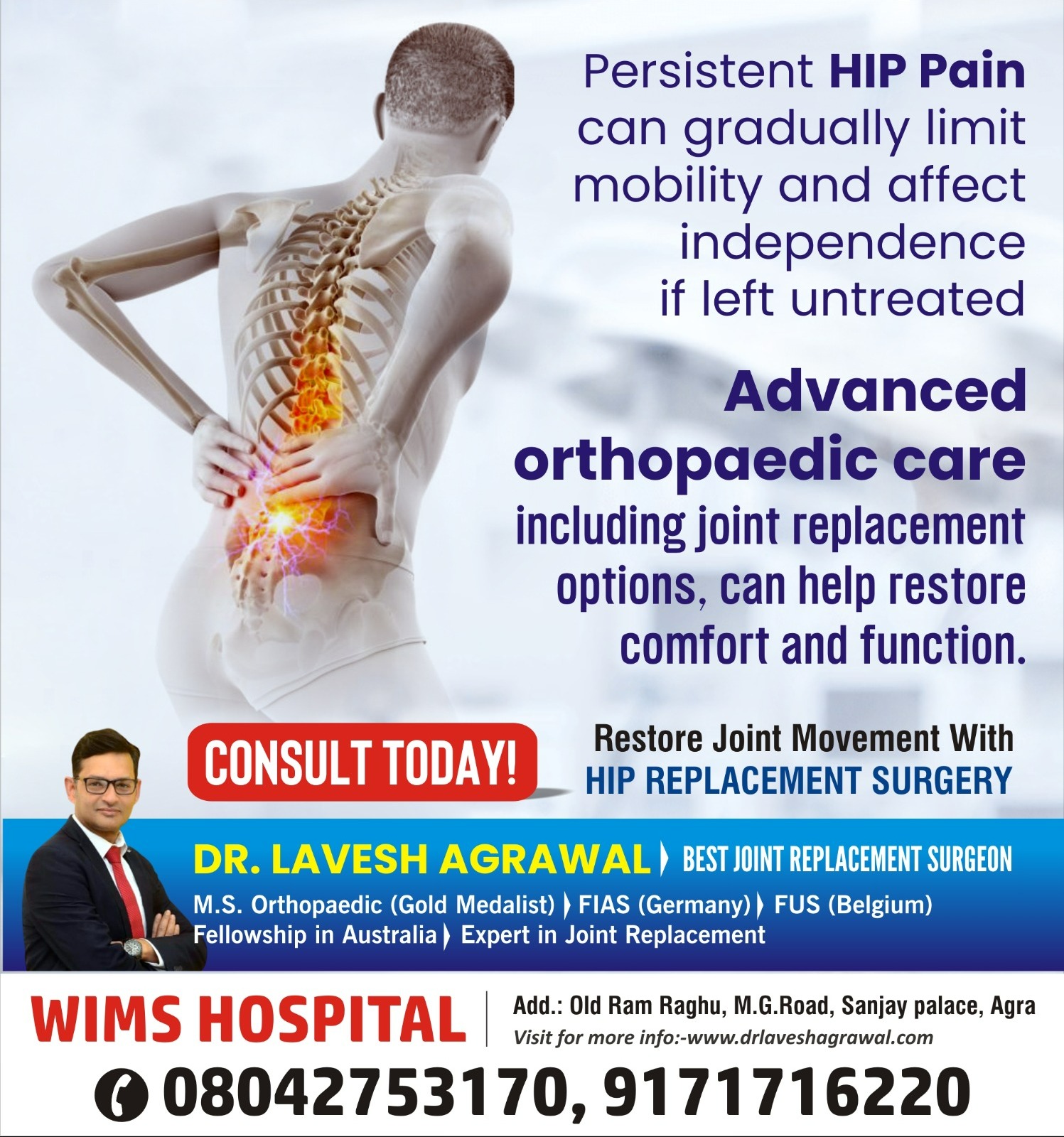 DR Lavesh Agrawal - Joint Replacement Surgeon Agra WIMS Hospital ( Ram Raghu ) LIC Building, Mahatma Gandhi Rd, opp. Agra, Ramnagar Colony, Civil Lines, Agra, Uttar Pradesh 282002 +918042753170 laveshdoc@gmail.com