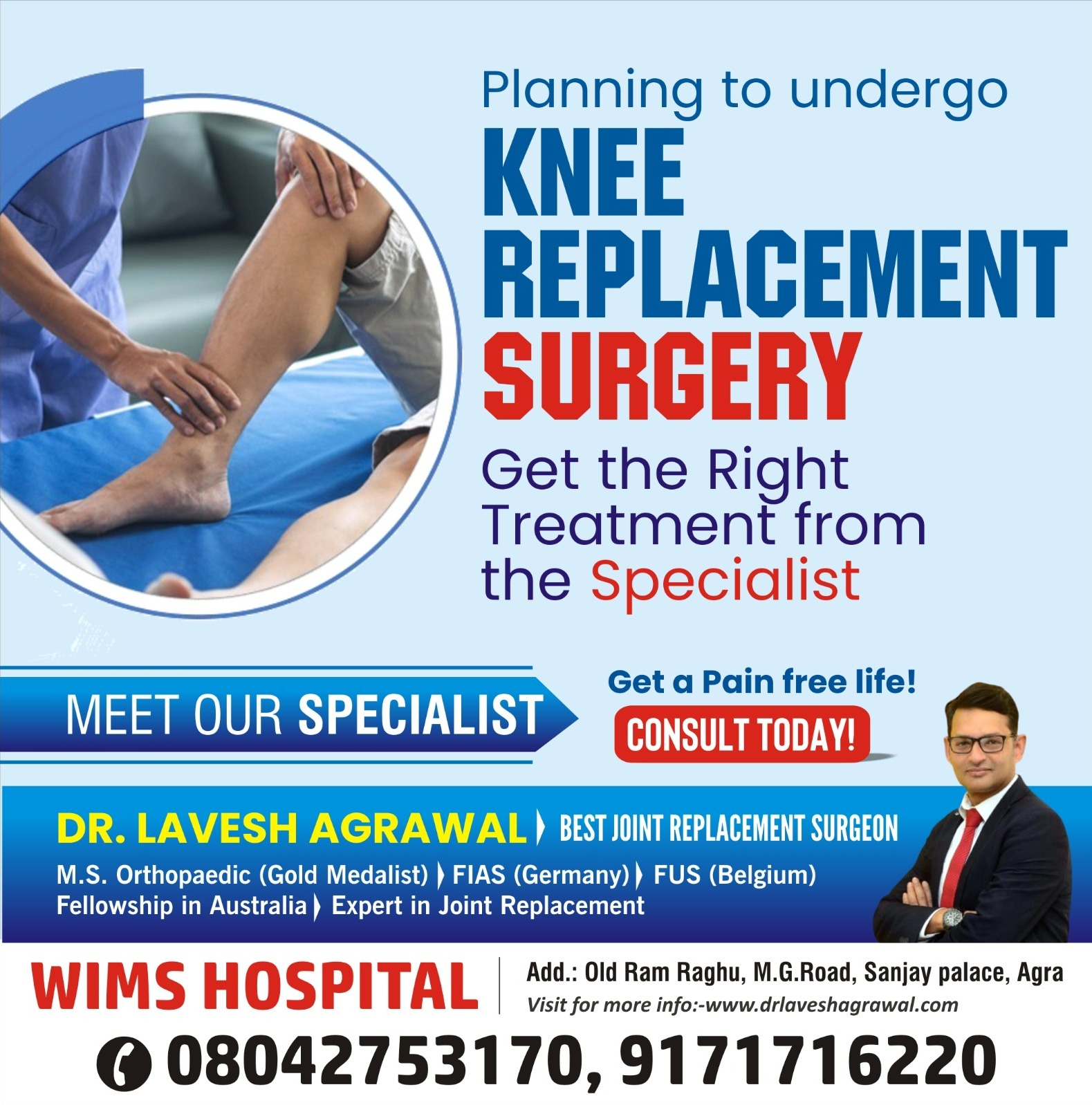Best Knee Replacement Surgery in Agra Looking for the best knee replacement surgery in Agra? Dr. Lavesh Agrawal offers advanced and reliable knee replacement treatment at WIMS Hospital, helping patients regain pain-free mobility and a better quality of life. Knee replacement surgery is recommended for patients suffering from severe knee arthritis, chronic pain, stiffness, swelling, or difficulty in walking when non-surgical treatments fail. Under Dr. Lavesh Agrawal’s expertise, patients benefit from precise surgical techniques, modern implants, and comprehensive post-operative care. Benefits of knee replacement surgery include: * Significant pain relief * Improved knee movement and flexibility * Better walking ability and stability * Correction of knee deformity * Long-lasting joint function WIMS Hospital is equipped with modern operation theaters, advanced technology, and a skilled medical team to ensure safe surgery and faster recovery. If knee pain is limiting your daily activities, consult Dr. Lavesh Agrawal for trusted knee replacement surgery in Agra and take a confident step toward an active, pain-free life.