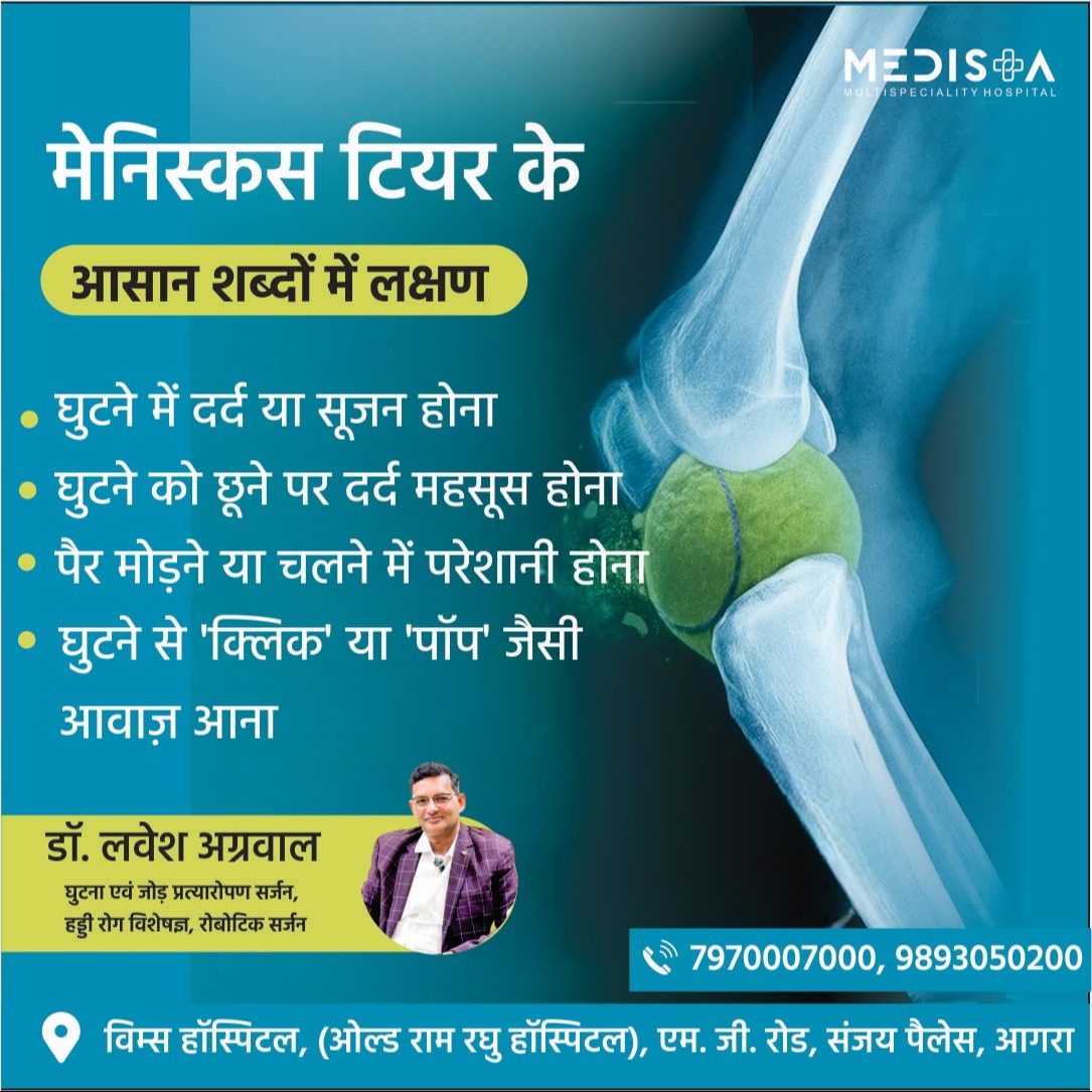 Best Meniscus Tear Treatment in Agra - Dr. Lavesh Agrawal | VIMS Hospital Knee pain can make daily activities like walking, bending, or climbing stairs difficult. One of the common causes behind such pain is a Meniscus Tear, which happens when the knee’s cushioning cartilage gets damaged or torn. At VIMS Hospital, M.G. Road, Sanjay Place, Agra, Dr. Lavesh Agrawal - Knee & Joint Replacement Surgeon and Orthopedic Specialist - provides expert treatment for Meniscus Tears using advanced techniques and compassionate care. 🦵 What Is a Meniscus Tear? The meniscus is a C-shaped cartilage located between your thighbone and shinbone. It acts as a natural shock absorber. A tear can occur due to sudden twisting, sports injuries, or gradual wear and tear with age. Common Symptoms Include: - Knee pain or swelling - Difficulty in bending or walking - Clicking or popping sound in the knee - Pain while climbing stairs Ignoring these early symptoms may lead to permanent joint damage later. Expert Care by Dr. Lavesh Agrawal With years of experience in Knee Surgery and Sports Injury Treatment, Dr. Lavesh Agrawal focuses on restoring comfort, movement, and confidence for every patient. Treatment Options Include: - Arthroscopic Meniscus Repair - Partial Meniscectomy (removal of torn tissue)- - Physiotherapy & Rehabilitation Support - Non-surgical treatment (when possible) Each patient receives a personalized recovery plan designed for faster healing and long-term joint health. Why Choose VIMS Hospital, Agra? VIMS Hospital is known for its modern facilities and patient-first approach. Here’s what you can expect: - Advanced Diagnostic Tools (MRI, X-Ray, etc.) - Minimally Invasive Arthroscopy - faster recovery, less pain - Dedicated Physiotherapy and Rehabilitation - Personalized care by experienced professionals From diagnosis to full recovery - you receive expert guidance at every step. Fast Recovery and Long-Term Relief With Arthroscopic Meniscus Treatment, most patients can walk within hours after the procedure. Within a few weeks, they return to their normal activities or even sports - pain-free and confident again. Dr. Lavesh Agrawal’s mission is simple: “To help you get back to a pain-free, active life.” His precision surgeries and caring approach make him one of Agra’s most trusted Orthopedic Surgeons. 📅 Book Your Appointment Today If you’re facing knee pain, swelling, or a clicking sound — don’t ignore it. Early diagnosis and treatment can save your joint from further damage. 📍 VIMS Hospital (Old Ram Raghu Hospital), M.G. Road, Sanjay Place, Agra 📞 7970007000 | 9893050200 Dr. Lavesh Agrawal – where expertise meets empathy, and every step brings you closer to a pain-free life.