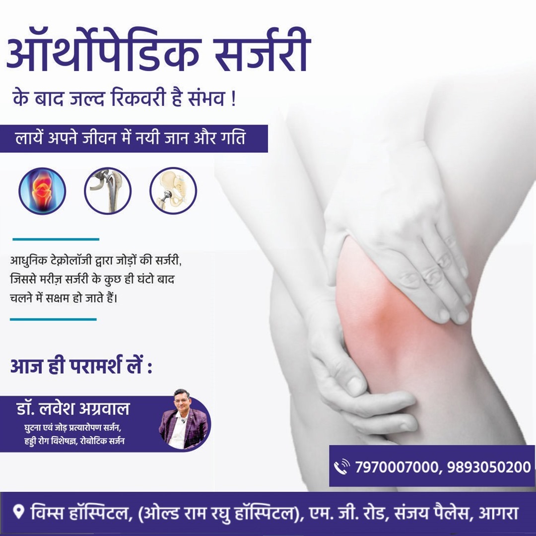 Best Orthopedic Surgeon in Agra - Dr. Lavesh Agrawal | Vishwas Hospital Living with joint pain can make even simple movements difficult -walking, climbing stairs, or getting out of bed can feel like a challenge. At Vishwas Hospital, MG Road, Agra, Dr. Lavesh Agrawal, one of the best orthopedic and joint replacement surgeons in Agra, offers advanced solutions to help you regain strength, movement, and confidence. Expert in Joint Replacement and Orthopedic Surgery Dr. Lavesh Agrawal specializes in knee and hip replacement, fracture management, sports injuries, and arthritis care. With years of surgical experience and a compassionate approach, he focuses on minimally invasive orthopedic procedures that ensure faster recovery and long-term comfort. Using modern surgical technology and precision techniques, Dr. Agrawal has helped hundreds of patients overcome joint pain and return to active, pain-free living. His approach combines expert diagnosis, advanced treatment, and personalized rehabilitation to achieve the best possible outcomes. Fast Recovery with Advanced Technology At Vishwas Hospital, patients benefit from the latest joint replacement and arthroscopy techniques, designed to minimize pain and speed up healing. Many patients are able to walk within hours of surgery, thanks to the use of advanced implants and enhanced recovery protocols. Each treatment plan is tailored individually - ensuring that every patient receives care according to their health condition, age, and lifestyle. From the first consultation to post-surgery physiotherapy, Dr. Agrawal and his team stay closely involved in every step of the recovery journey. Why Choose Dr. Lavesh Agrawal? ✅ Expert in Knee & Hip Replacement Surgery ✅ Minimally Invasive Techniques for Faster Recovery ✅ Comprehensive Pre & Post-Surgical Care ✅ High Success Rate with Modern Equipment ✅ Compassionate, Patient-Centered Approach Dr. Agrawal’s goal is not just to perform successful surgeries but to ensure that patients return to a better quality of life - free from pain and full of movement. Conditions Treated: - Osteoarthritis and Rheumatoid Arthritis - Sports and Ligament Injuries - Knee and Hip Joint Pain - Fractures and Bone Injuries - Shoulder and Spine Disorders Whether you are dealing with long-term pain or recovering from an injury, Dr. Lavesh Agrawal provides the best orthopedic treatment in Agra with trust, care, and proven results. Visit Vishwas Hospital, Agra If you’re searching for the best orthopedic surgeon in Agra, visit Vishwas Hospital (Old Ram Raghu Hospital), MG Road, Sanjay Palace, Agra. Let your journey to a pain-free, active life begin today. 📞 Call for Appointment: 7970007000 / 9893050200 📍 Location: Vishwas Hospital, (Old Ram Raghu Hospital), MG Road, Sanjay Palace, Agra