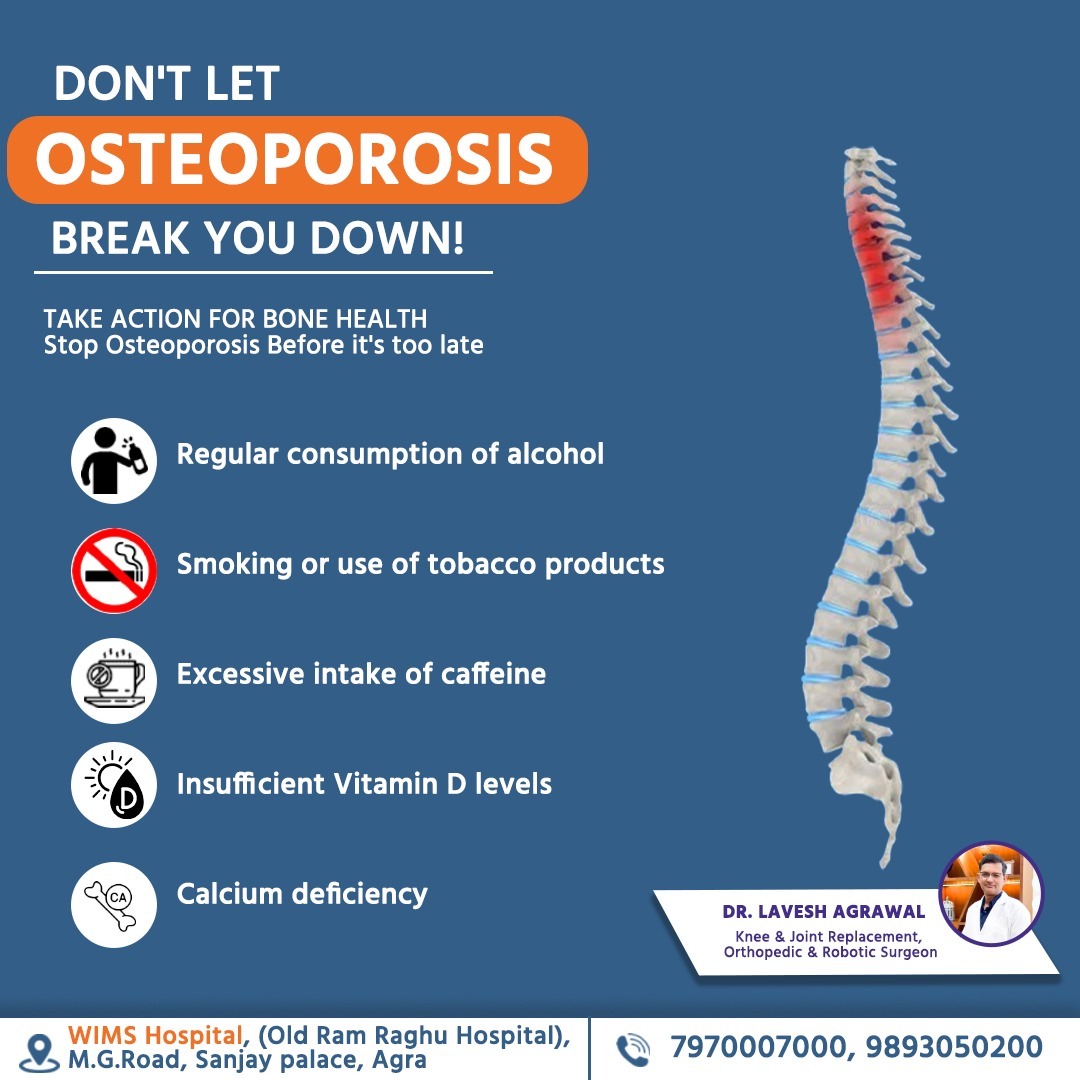 Best Osteoporosis Treatment in Agra - Dr. Lavesh Agrawal | WIMS Hospital Osteoporosis is one of the most common bone conditions affecting both men and women, especially after the age of 40. But the painful truth is that most people don’t even realize they have weak bones until a fracture happens. If you are experiencing frequent back pain, reduced height, or sudden fractures from minor falls, these could be early signs of osteoporosis. At WIMS Hospital (Old Ram Raghu Hospital), M.G. Road, Sanjay Palace, Agra, Dr. Lavesh Agrawal, a highly trusted Knee & Joint Replacement, Orthopedic & Robotic Surgeon, offers specialized diagnosis and advanced treatment for osteoporosis. What Is Osteoporosis? Osteoporosis is a condition where bones become fragile and lose their strength due to reduced bone density. Over time, the bones become porous, brittle, and more likely to break. Common fracture areas include the spine, wrist, and hip. What makes osteoporosis dangerous is that it progresses silently. Many patients come to the hospital only after a spine fracture or severe chronic back pain. Common Causes & Risk Factors of Osteoporosis Most people don’t know what leads to weak bones. Some common causes include: -Regular alcohol consumption -Smoking or using tobacco products -Excessive caffeine intake (tea/coffee) -Low Vitamin D levels due to lack of sunlight -Calcium deficiency -Hormonal changes, especially in women after menopause -Sedentary lifestyle with very little physical activity -Family history of osteoporosis These factors slowly reduce bone strength without showing symptoms in the early stages. Signs You Should Not Ignore If you’re experiencing any of the symptoms below, it’s important to get your bones checked: -Persistent or chronic back pain -Sudden pain while walking or bending -Loss of height over time -Stooped posture or a bent back -Bone fractures from minor injuries -Identifying osteoporosis early can prevent severe fractures in the future. Why Choose Dr. Lavesh Agrawal for Osteoporosis Treatment in Agra? Dr. Lavesh Agrawal is known for his patient-focused approach, clear explanations, and advanced treatment methods. People from across Agra visit him for bone-related issues because: -He provides a complete bone health evaluation -Uses modern diagnostic tools for accurate results -Suggests customized treatment plans based on your condition -Focuses on medication + lifestyle + nutrition for long-term recovery -Helps patients prevent fractures through timely guidance His experience in orthopedics, joint replacement, and robotic-assisted procedures makes him one of the most trusted doctors for osteoporosis treatment in Agra. Treatment Options Available At WIMS Hospital, patients receive a combination of treatments that help rebuild bone strength and prevent future damage: ✔ Bone Density (DEXA) Scan To measure bone strength and detect osteoporosis early. ✔ Medication To improve bone formation and reduce bone loss. ✔ Vitamin D & Calcium Supplementation To strengthen bones naturally and maintain the right levels. ✔ Lifestyle Modifications Dietary guidance, safe exercises, and posture correction. ✔ Fall Prevention Counseling Especially important for elderly patients to reduce fracture risk. How You Can Prevent Osteoporosis -Small daily changes can protect your bones: -Take Vitamin D and spend time in sunlight -Increase Calcium-rich foods like milk, paneer, ragi, sesame Reduce caffeine and alcohol -Quit smoking Stay active with walking, yoga, and light exercise These steps can significantly improve bone strength over time. Book Your Osteoporosis Consultation in Agra If you suspect weak bones or are dealing with chronic pain, do not ignore it. Early diagnosis can save you from painful fractures and long-term complications. Dr. Lavesh Agrawal is here to help you regain bone strength, mobility, and a healthier life. 📍 WIMS Hospital (Old Ram Raghu Hospital) M.G. Road, Sanjay Palace, Agra 📞 7970007000 | 9893050200