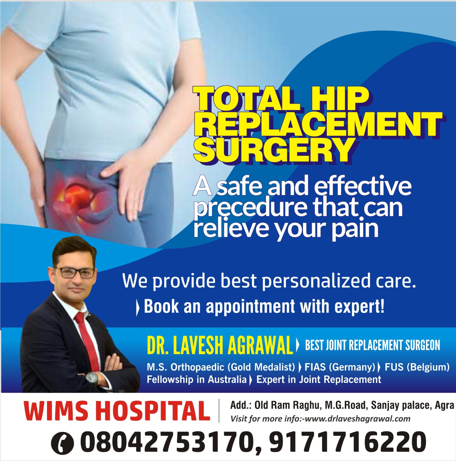 Best Total Hip Replacement Surgeon Near Me In Agra Hip replacement surgery is a commonly performed procedure by the best Orthopedic to alleviate severe hip pain. This surgical intervention involves the replacement of a damaged hip joint with an artificial one, offering substantial relief to individuals experiencing such discomfort. It helps in relieving your hip pain, and a safe and quick recovery to move like before. If you are looking for Top Hip Replacement Surgeon in Agra then call Wims Hospital to consult with the Best Hip Replacement Doctor in Agra. Schedule your appointment now! Best Hip Replacement Surgeon In Agra | Top Doctor For Hip Replacement Surgery in Agra, U.P. |Top Hip Replacement Surgery In Agra | Hip Replacement Surgeon in U.P.