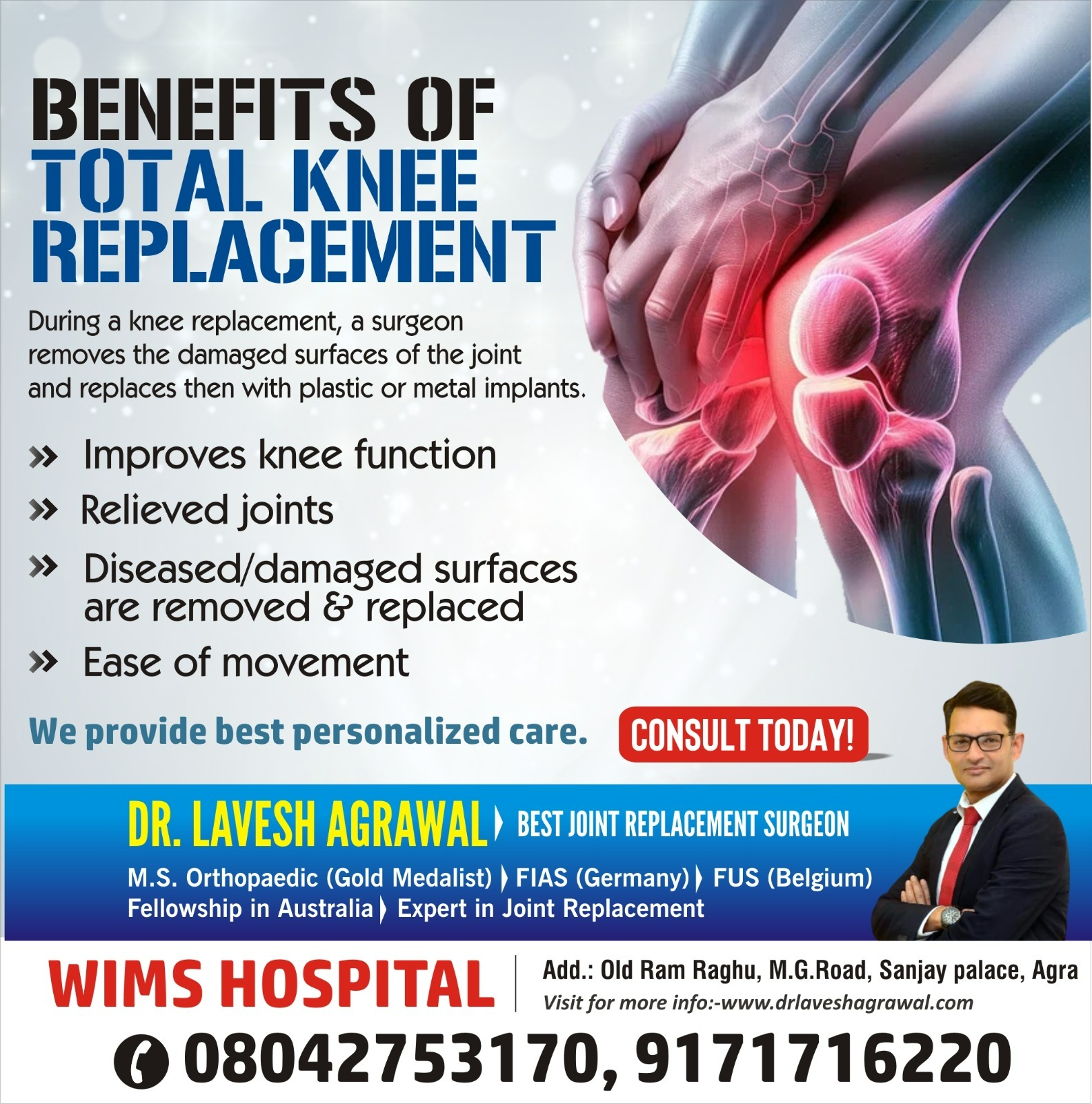 Best Total Knee Replacement Surgeon in Agra If you are looking for the best total knee replacement surgeon in Agra, Dr. Lavesh Agrawal at WIMS Hospital is a highly trusted name for advanced orthopedic care. Dr. Lavesh Agrawal specializes in total knee replacement surgery to help patients suffering from severe knee pain, arthritis, stiffness, and mobility issues regain an active and pain-free life. He uses modern surgical techniques, high-quality knee implants, and precise planning to ensure long-lasting results and faster recovery. Each patient receives detailed pre-surgery evaluation, personalized treatment, and complete post-operative rehabilitation guidance. Known for his ethical practice, compassionate approach, and excellent surgical outcomes, Dr. Lavesh Agrawal best orthopedic specialist in Agra has successfully treated numerous patients from Agra and nearby regions. Take a confident step towards a pain-free future and improved mobility with expert total knee replacement surgery at WIMS Hospital, Agra.