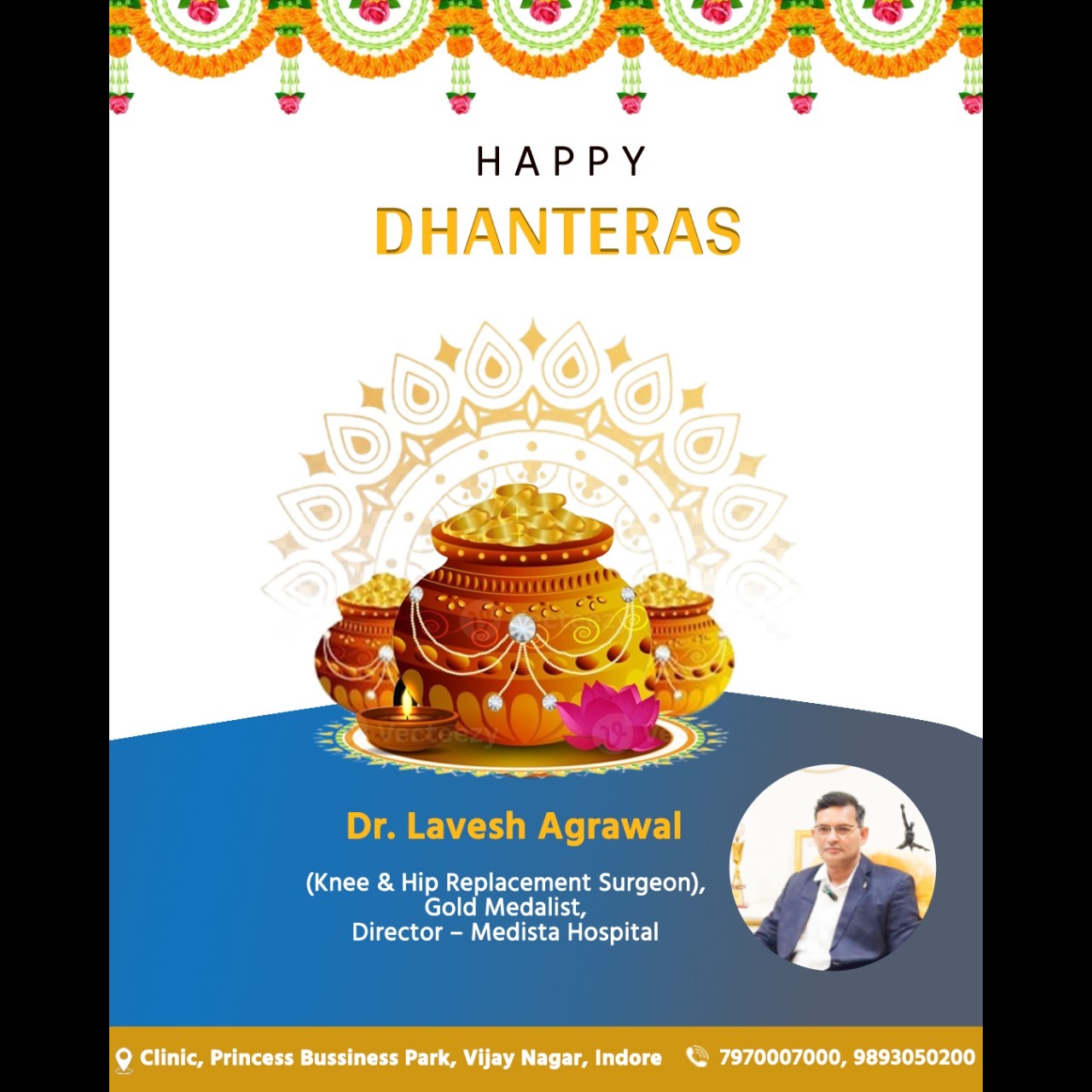 Dhanteras is more than just the beginning of Diwali - it’s a celebration of health, prosperity, and positivity. On this special day, when people bring home gold and silver as symbols of good fortune, it’s also the perfect time to remember the one treasure that truly defines our quality of life - good health. Because no amount of wealth can replace the freedom of moving pain-free and living actively. At Dr. Lavesh Agrawal’s Orthopaedic Clinic, we believe that your body, especially your joints and bones, is your true asset. They carry you through every phase of life - from your first steps as a child to the strength that supports you as you grow older. This Dhanteras, let’s celebrate not just material wealth, but the physical well-being that keeps us moving forward with confidence and joy. Dr. Lavesh Agrawal, one of the best orthopedic surgeons in Indore, has dedicated his career to helping people regain mobility, strength, and comfort. His approach to orthopedics focuses on precise diagnosis, personalized treatment, and long-term care. Whether you’re dealing with knee pain, shoulder stiffness, sports injuries, or age-related joint problems, timely medical attention can make all the difference. Ignoring minor pain today can lead to major issues tomorrow - and this festive season is the perfect reminder to take that first step toward healing. For many, knee and joint pain starts small — maybe a little stiffness in the morning or discomfort while climbing stairs. But these are often early warning signs. Over time, they can limit movement and affect your overall lifestyle. At Dr. Lavesh Agrawal’s Clinic, the goal is not just to treat the pain, but to address its root cause. Through a combination of advanced medical techniques, patient education, and personalized rehabilitation, Dr. Agrawal ensures that each patient receives care tailored to their specific needs. Dhanteras teaches us the importance of protecting what we value. So this year, while you buy gold or light diyas for prosperity, take a moment to invest in your health - especially your bone and joint health. Regular exercise, maintaining a healthy weight, and seeking early medical advice are simple but powerful ways to protect your mobility for years to come. As an experienced orthopedic specialist in Indore, Dr. Lavesh Agrawal emphasizes preventive care as much as treatment. Strengthening your muscles, staying active, and following proper posture habits can go a long way in keeping your joints strong and flexible. And if pain or discomfort is already affecting your day-to-day life, don’t delay. Early diagnosis and expert guidance can help you recover faster and avoid long-term complications. On this auspicious occasion of Dhanteras, Dr. Lavesh Agrawal and his team extend heartfelt wishes to you and your family. May this festival bring you not only wealth and happiness but also the strength and wellness to enjoy life to its fullest. Let the light of Dhanteras remind us all that our health is the brightest treasure we possess - one that deserves care, attention, and gratitude every single day. This festive season, promise yourself better health. Don’t let pain hold you back from doing what you love. Take a step toward stronger bones, healthier joints, and a more active lifestyle with guidance from Dr. Lavesh Agrawal, your trusted orthopedic surgeon in Indore. May your Dhanteras shine with good health, happiness, and renewed strength - because when you’re pain-free and active, every day feels like a celebration.