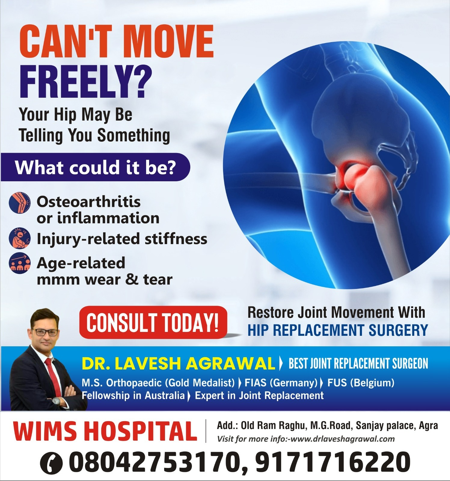 Hip Replacement Surgery in Agra Struggling with hip pain and not be able to move freely? Your hip may be telling you something important. Don’t ignore early signs like stiffness, discomfort, or difficulty in walking. It could be due to osteoarthritis or inflammation, injury-related stiffness, or age-related wear and tear that gradually limits your mobility. For expert care, consult Dr. Lavesh Agrawal, the hip replacement surgeon in Agra at WIMS Hospital. With advanced diagnostic techniques and personalized treatment plans, he helps patients regain movement and live pain-free. Whether your condition requires medication, physiotherapy, or surgical intervention, you’ll receive the right care tailored to your needs. Take the first step toward a pain-free life. Don’t let hip pain control your routine—get expert guidance with Dr. Lavesh Agrawal best orthopedic doctor in Agra and restore your mobility with confidence today.