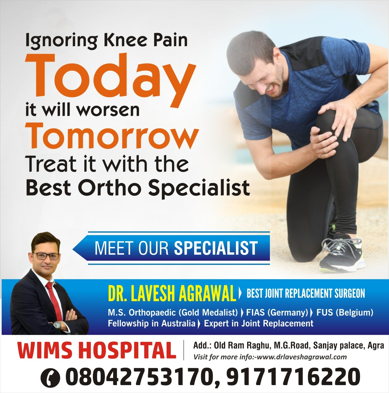 Ignoring knee pain today? It may get worse tomorrow! If you’re struggling with knee pain, stiffness, or difficulty walking, it’s time to consult the best doctor for knee pain in Agra — Dr. Lavesh Agrawal at WIMS Hospital. Early diagnosis and timely treatment can prevent long-term damage and help you stay active without pain. Dr. Lavesh Agrawal specializes in advanced knee pain management, arthritis treatment, ligament injuries, and knee replacement solutions with a patient-focused approach. From non-surgical care to advanced surgical options, you receive complete and personalized treatment. Don’t let knee pain limit your daily life or mobility. Taking action today can save you from severe pain and surgery tomorrow.