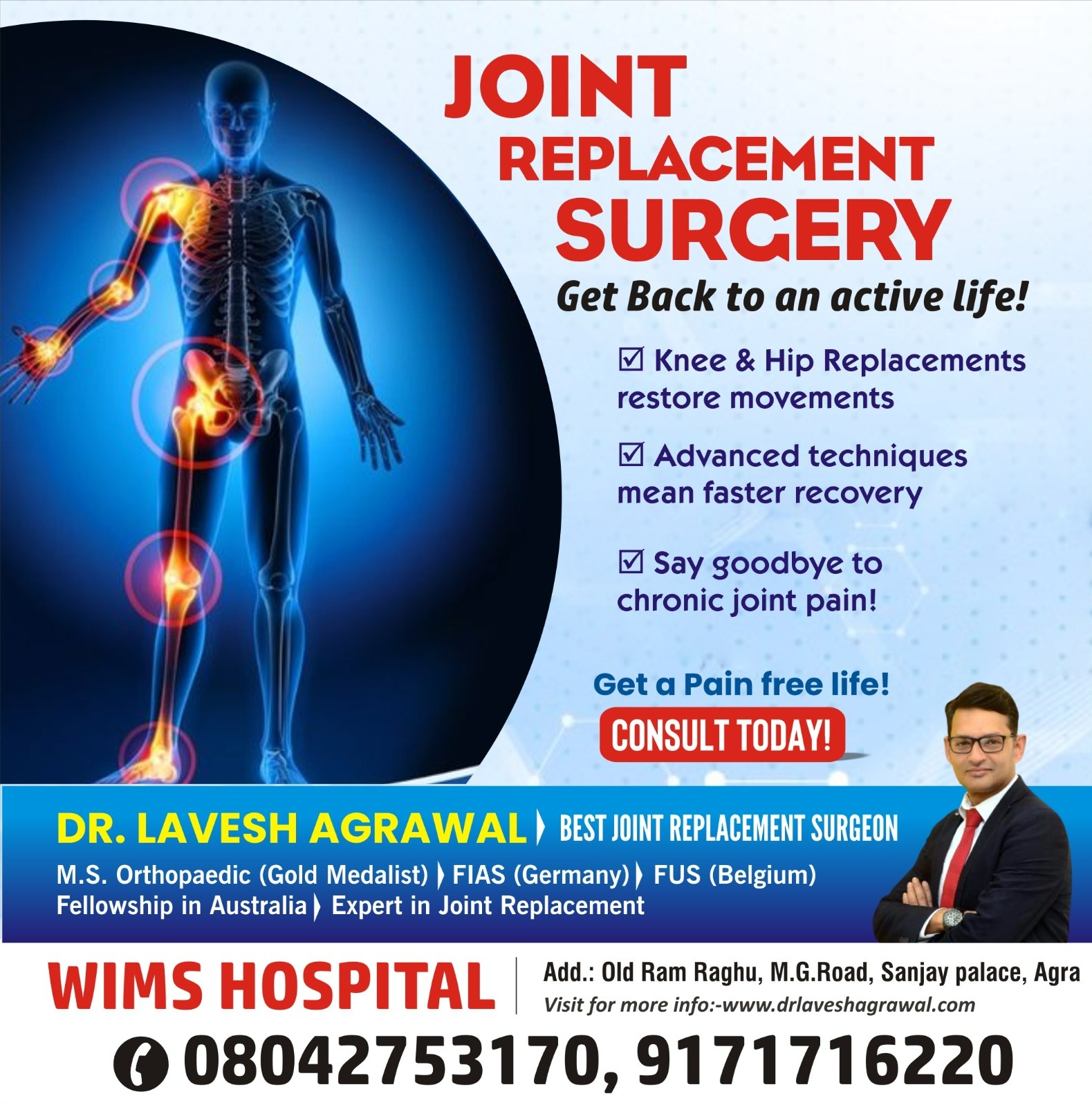 Joint Replacement Surgery in Agra If you are suffering from severe joint pain, stiffness, or difficulty walking, joint replacement surgery in Agra by Dr. Lavesh Agrawal at WIMS Hospital offers a reliable solution for long-term pain relief and improved mobility. Dr. Lavesh Agrawal is a highly experienced orthopedic surgeon specializing in knee and hip replacement surgeries using advanced techniques for safe and effective outcomes. Joint replacement surgery is recommended for patients with arthritis, joint degeneration, or injury that does not respond to medication or physiotherapy. At WIMS Hospital, patients benefit from modern operation theatres, advanced implants, and a dedicated orthopedic care team that ensures accurate diagnosis, safe surgery, and faster recovery. Dr. Lavesh Agrawal best orthopedic doctor in Agra provides personalized treatment plans, focusing on minimal pain, better joint function, and early return to daily activities. Comprehensive pre-surgery evaluation and post-operative rehabilitation help achieve the best results. With a strong record of successful surgeries and patient satisfaction, Dr. Lavesh Agrawal is a trusted name for joint replacement surgery in Agra. Choose expert care at WIMS Hospital and step into a pain-free, active life.