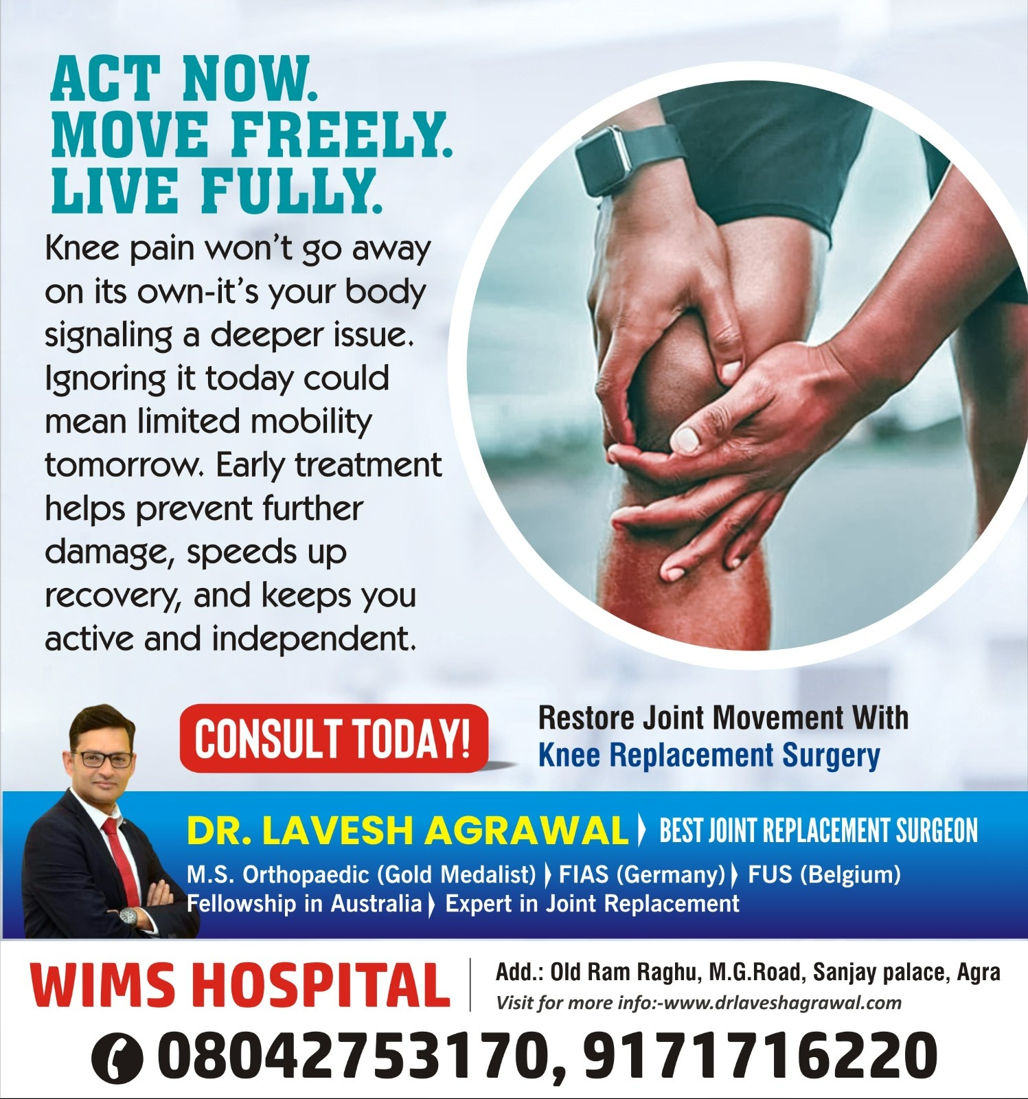 Knee Replacement Surgeon in Agra Dr. Lavesh Agrawal is a highly trusted knee replacement surgeon in Agra, offering advanced and effective treatment at WIMS Hospital. He specializes in total and partial knee replacement for conditions such as severe arthritis, joint degeneration, injury, and chronic knee pain. Using modern surgical techniques and precision-based planning, Dr. Lavesh Agrawal best orthopedic doctor in Agra ensures minimal pain, faster recovery, and long-lasting results. At WIMS Hospital, patients receive comprehensive care including detailed evaluation, advanced diagnostics, personalized treatment plans, and structured rehabilitation support after surgery. His patient-focused approach, surgical expertise, and commitment to safety make him a preferred choice for knee replacement in Agra. If you are experiencing stiffness, swelling, or difficulty walking due to knee problems, consult Dr. Lavesh Agrawal for safe, reliable, and advanced knee replacement surgery with improved mobility and quality of life.