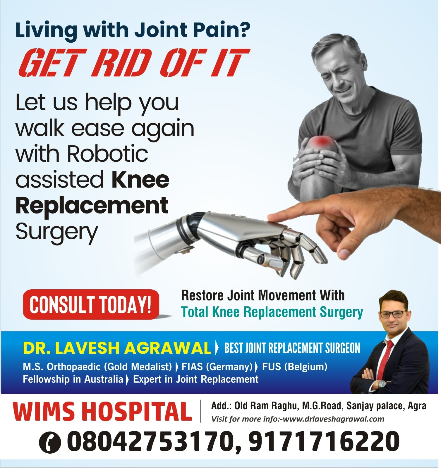 Knee Replacement Surgery in Agra Looking for expert Knee Replacement Surgery in Agra? Dr. Lavesh Agrawal at WIMS Hospital, Agra offers advanced and result-oriented knee replacement procedures for patients suffering from severe knee pain, arthritis, joint stiffness, and mobility issues. When medications, injections, and physiotherapy no longer provide relief, knee replacement surgery becomes a reliable and long-term solution. Dr. Lavesh Agrawal is a highly skilled orthopedic surgeon known for precision, modern surgical techniques, and patient-centered care. At WIMS Hospital, advanced technology and well-equipped operation theatres ensure safe procedures, minimal complications, and faster recovery. The surgery helps relieve chronic pain, correct deformities, and restore smooth joint movement, allowing patients to return to an active and independent lifestyle. Comprehensive pre-surgery evaluation and personalized rehabilitation programs are provided to ensure optimal outcomes. If you are struggling with knee pain and limited mobility, consult Dr. Lavesh Agrawal at WIMS Hospital in Agra for safe, effective, and long-lasting knee replacement surgery.