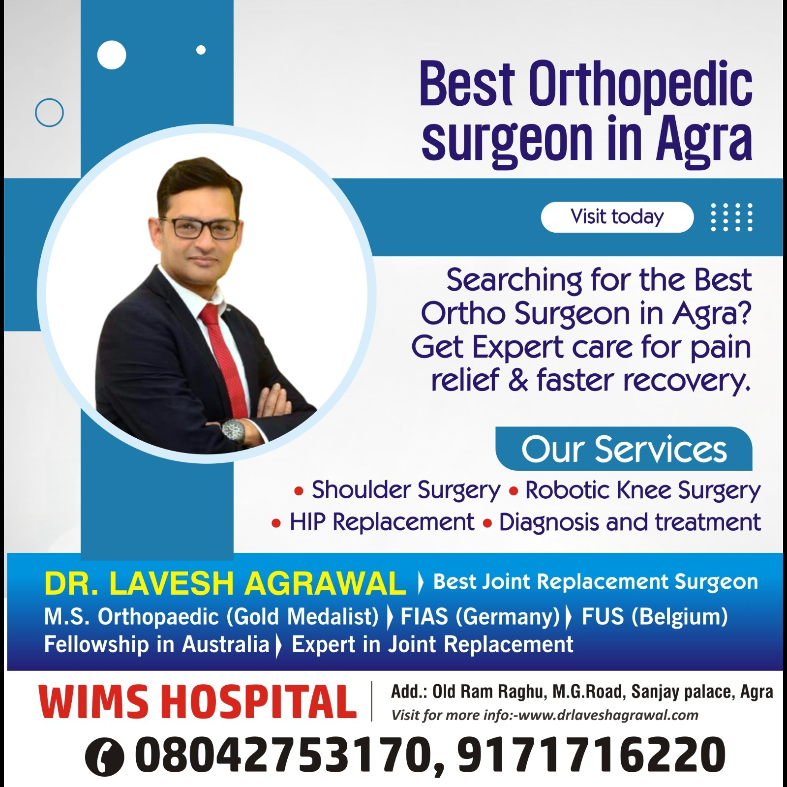 🦴 Looking for the Best Orthopedic Surgeon in Agra? Your search ends with Dr. Lavesh Agrawal at WIMS Hospital, a trusted name in advanced orthopedic care. From joint pain and fractures to knee, hip, and shoulder treatments, Dr. Lavesh Agrawal provides expert diagnosis, modern procedures, and personalized care to help you move freely again. With his skilled hands and patient-focused approach, recovery becomes faster, safer, and more comfortable. Whether you’re struggling with chronic joint pain, sports injuries, arthritis, or need joint replacement surgery, Dr. Lavesh Agrawal ensures the best outcomes with world-class orthopedic solutions. Get back to a pain-free, active life with the right orthopedic care. ✔️Book your consultation today at WIMS Hospital, Agra. 📞804275 3170