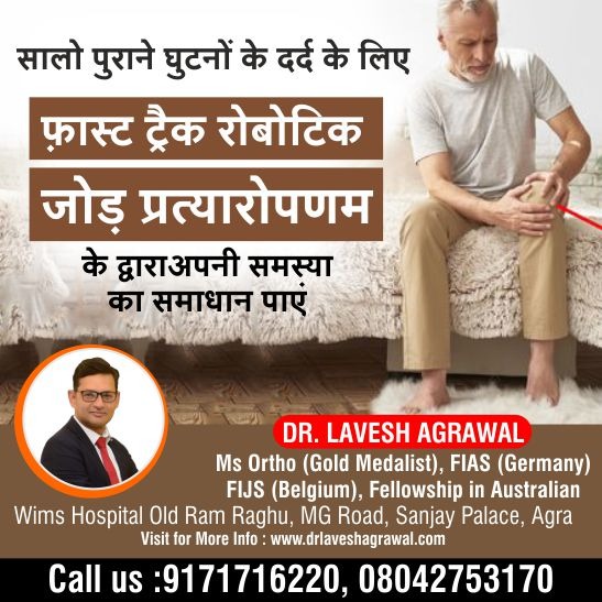 घुटनो के दर्द के लिए आगरा के सबसे अच्छे हड्डी रोग विशेषज्ञ क्या आप सालों से घुटनों के दर्द से परेशान हैं? क्या आप चलने, उठने-बैठने और अन्य दैनिक गतिविधियों में परेशानी महसूस करते हैं? अगर ऐसा है, तो फास्ट ट्रैक रोबोटिक जोड़ प्रत्यारोपणम आपके लिए एक बेहतरीन विकल्प हो सकता है। फास्ट ट्रैक रोबोटिक जोड़ प्रत्यारोपणम एक आधुनिक तकनीक है जो आपको जल्दी और आसानी से अपने घुटनों के दर्द से राहत दिला सकती है। इस तकनीक में एक रोबोट का उपयोग करके घुटने के जोड़ को सटीक रूप से प्रत्यारोपित किया जाता है। इससे सर्जरी के बाद की जटिलताओं का खतरा कम हो जाता है और रोगी जल्दी ठीक हो जाता है। फास्ट ट्रैक रोबोटिक जोड़ प्रत्यारोपणम के अन्य लाभों जैसे कम दर्द, कम रक्तस्राव, कम अस्पताल में रहने की अवधि, जल्दी से अपने दैनिक जीवन में लौटने की क्षमता का फायदा उठता सकते है। अगर आप सालों पुराने घुटनों के दर्द से परेशान हैं, तो आज ही एक डॉ. लवेश अग्रवाल, आगरा के जाने माने हड्डी रोग विशेषज्ञ से परामर्श ले सकते है। डॉ. लवेश अग्रवाल द्वारा फ़ास्ट ट्रैक रोबोटिक जोड़ प्रत्यारोपणम से आपकी घुटनो के दर्द की समस्या का समाधान हो सकता है और आपको एक दर्द मुक्त जीवन जीने में मदद कर सकता है। तो अभी संपर्क करे और घुटनो के दर्द से राहत पाए ।