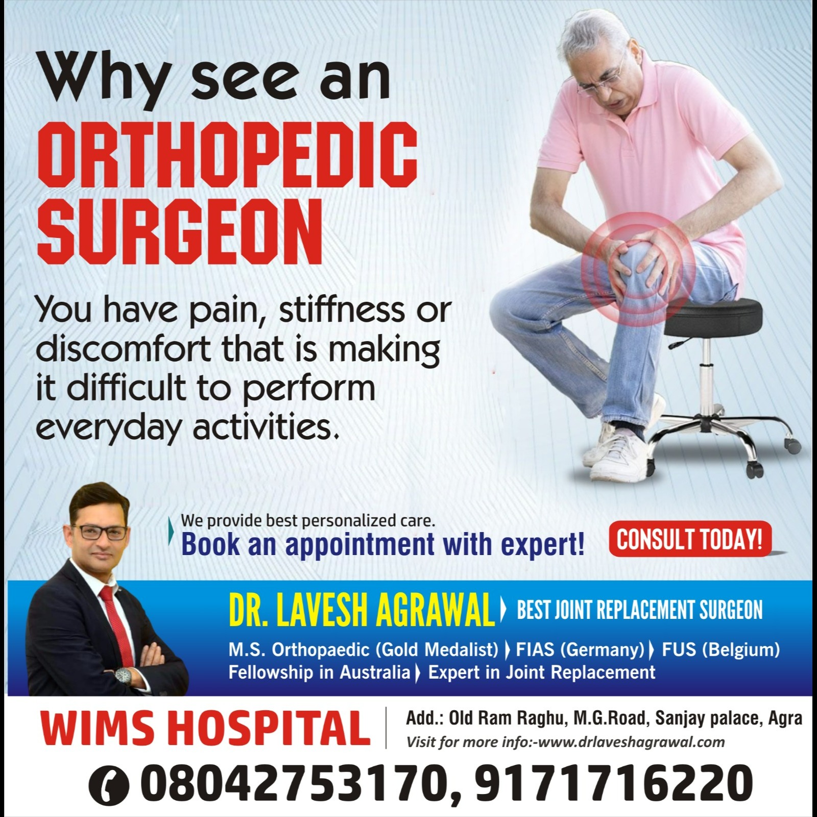 Struggling with joint pain, back pain, or sports injuries? Meet Dr. Lavesh Agrawal, the best orthopedic surgeon in Agra at WIMS Hospital! With years of expertise in joint replacement, knee & hip surgeries, slip disc treatment, frozen shoulder, and ligament injuries, Dr. Lavesh Agrawal provides advanced, precise, and personalized orthopedic care. Why choose Dr. Lavesh Agrawal? ✅ Accurate diagnosis & expert treatment ✅ Minimally invasive surgeries & faster recovery ✅ Patient-focused care with proven results Get back to an active and pain-free life with the trusted guidance of Dr. Lavesh Agrawal at WIMS Hospital, Agra. Book your appointment today and take the first step towards healthier joints!
