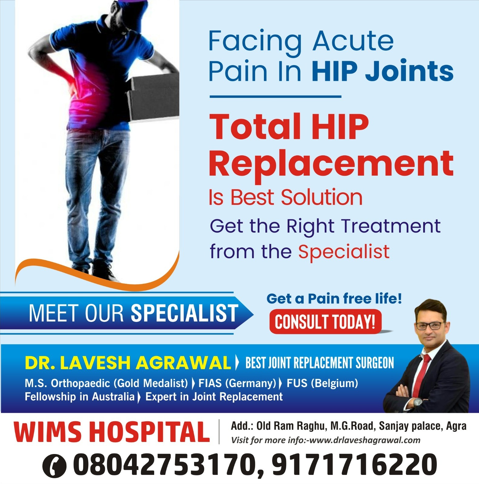 Total Hip Replacement Surgeon in Agra Dr. Lavesh Agrawal is a highly trusted total hip replacement surgeon in Agra, offering advanced and effective treatment at WIMS Hospital. He specializes in treating patients suffering from acute hip pain, hip arthritis, avascular necrosis, hip fractures, stiffness, and difficulty in walking. If you are facing severe or long-standing hip pain that limits daily activities such as walking, sitting, or sleeping, total hip replacement surgery can provide lasting relief and improved mobility. Dr. Lavesh Agrawal best orthopedic specialist in Agra follows a patient-centric approach, focusing on accurate diagnosis, advanced surgical techniques, and high-quality implants for better joint movement and long-term success. From detailed pre-surgical evaluation to structured post-surgery rehabilitation, patients receive complete care at every stage. For safe and reliable hip replacement surgery in Agra, consult Dr. Lavesh Agrawal at WIMS Hospital and regain a pain-free, active life.