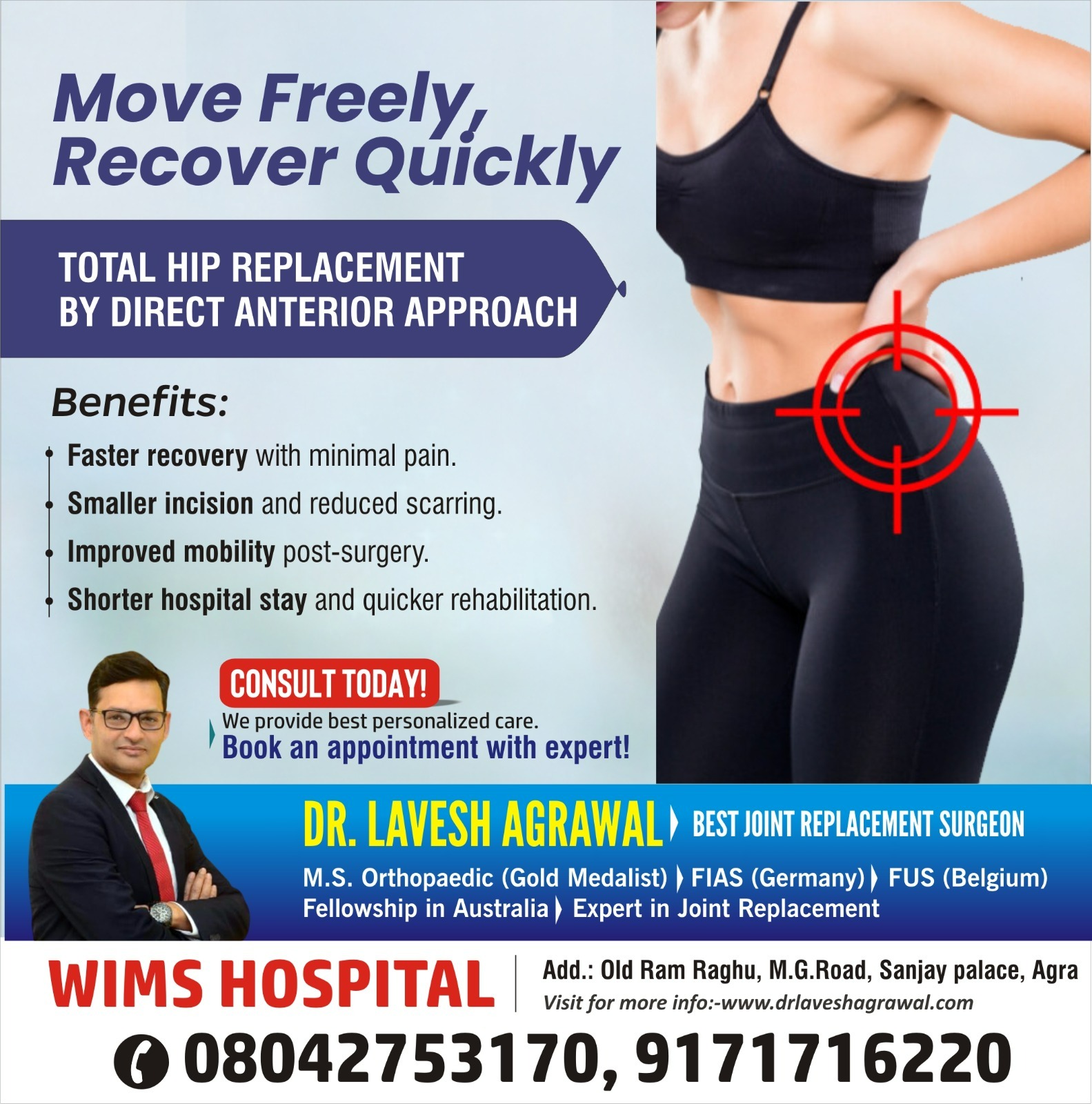 Total Hip Replacement Surgery in Agra For advanced total hip replacement surgery in Agra, Dr. Lavesh Agrawal offers expert treatment at WIMS Hospital using the anterior approach, a modern and minimally invasive technique. This approach allows the surgeon to replace the hip joint through the front of the hip, minimizing muscle damage and promoting faster recovery. Total hip replacement is recommended for patients suffering from severe hip pain due to arthritis, avascular necrosis, joint stiffness, injury, or reduced mobility affecting daily activities. Using advanced surgical techniques and high-quality implants, Dr. Lavesh Agrawal best orthopedic doctor in Agra ensures precise alignment, reduced post-operative pain, and improved joint function. The anterior approach enables quicker walking, shorter hospital stay, and faster return to normal life. At WIMS Hospital, patients receive comprehensive pre-surgical evaluation, advanced operation theatre facilities, and structured post-surgery rehabilitation. With a strong focus on safety, precision, and long-term outcomes, Dr. Lavesh Agrawal is a trusted choice for anterior approach total hip replacement surgery in Agra.